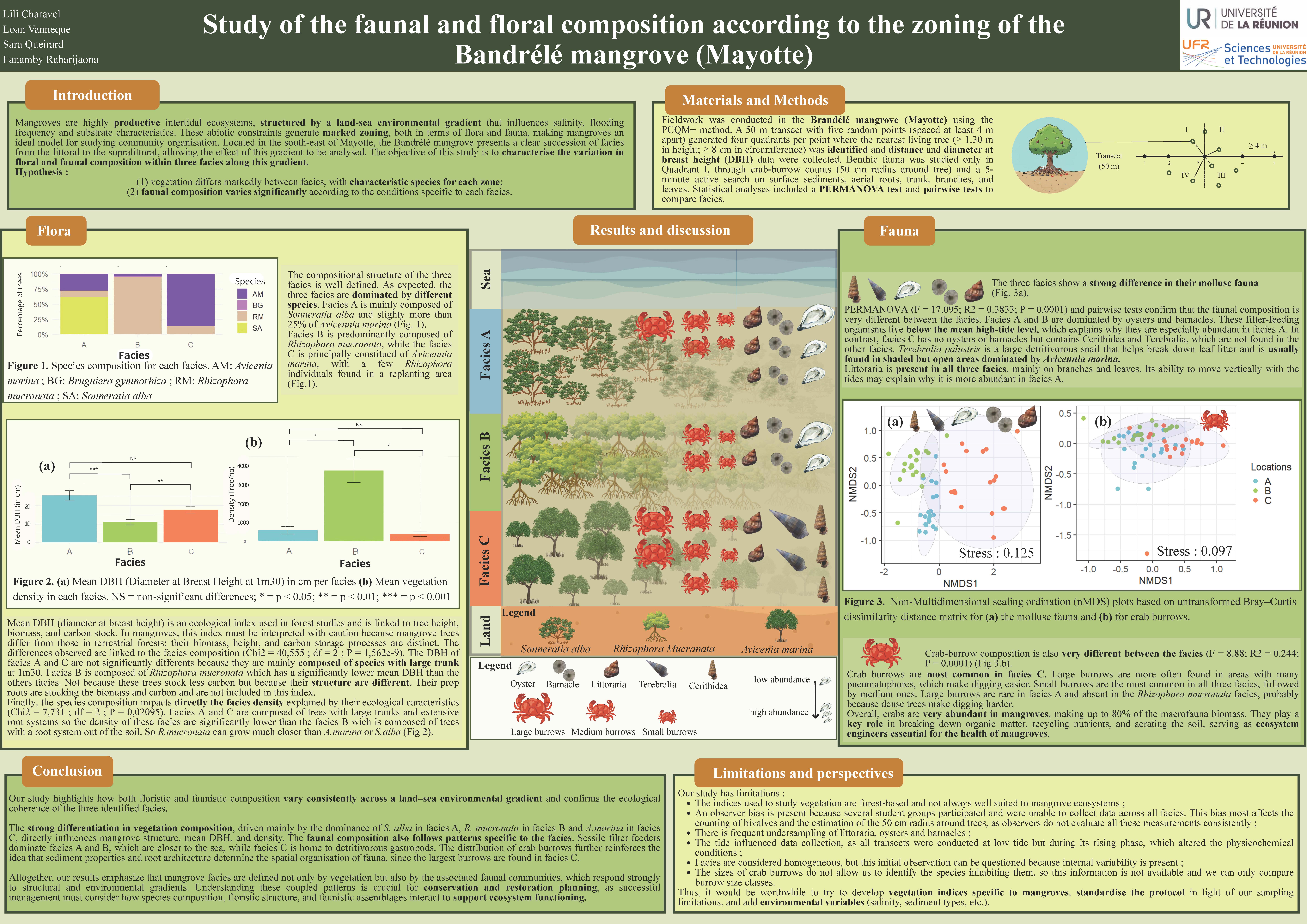 - Lili Charavel, Loan Vanneque, Sara Queirard, Fanamby Raharijaona – Study of the faunal and floral composition according to the zoning of the Bandrélé mangrove (Mayotte)