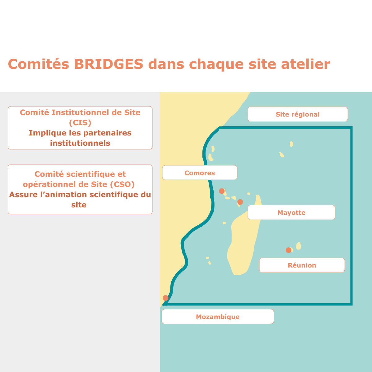 CSO (Comité scientifique et opérationnel de site) : implique les partenaires scientifiques locaux. Ce comité permet d’assurer une animation scientifique ancrée, grâce au relais d’informations et aux échanges scientifiques autour des différentes activités menées dans le Programme. L’objectif est d’assurer un déploiement cohérent et intégré avec le travail effectué par les partenaires sur les thématiques BRIDGES.
