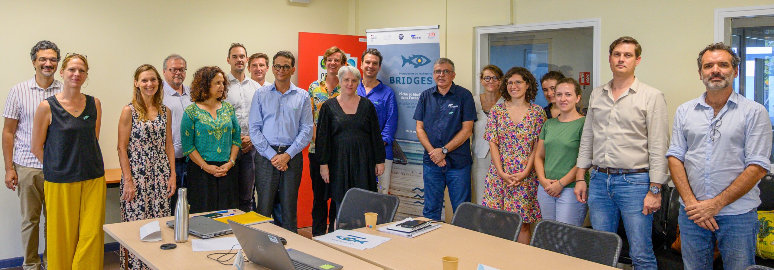 - Pour BRIDGES : Joachim Claudet, Directeur BRIDGES pour le CNRS, Emmanuelle Roque, Directrice BRIDGES pour l’Ifremer, Adrien Comte, Porteur de BRIDGES IMPACT, Sophie Boutin, Cheffe de Programme BRIDGES , Sarah Bareigts, Chargée de communication BRIDGES, Julie Furiga, Ingénieur BRIDGES INFORMATION